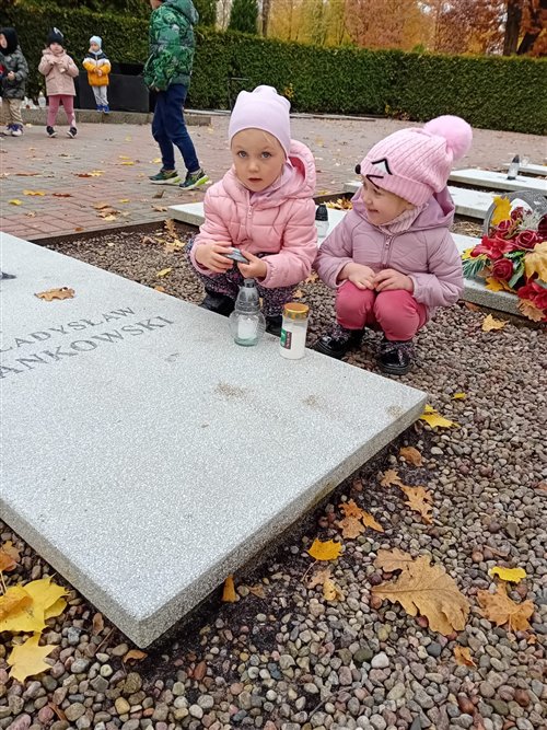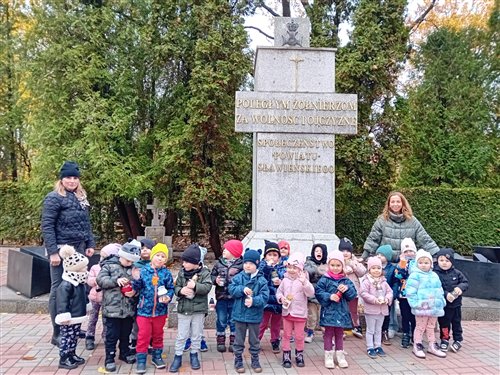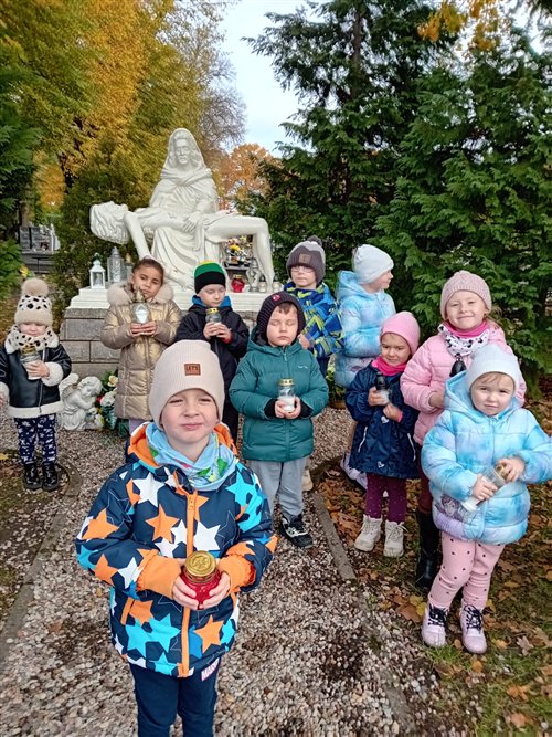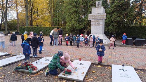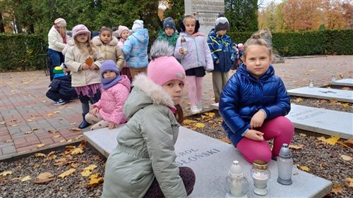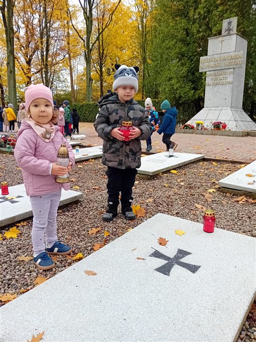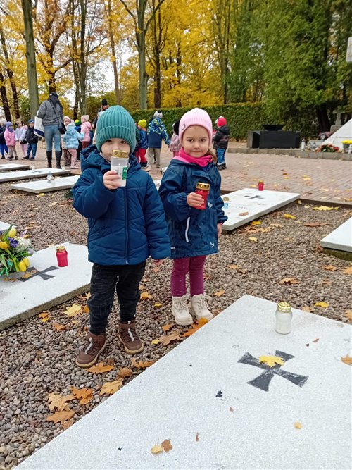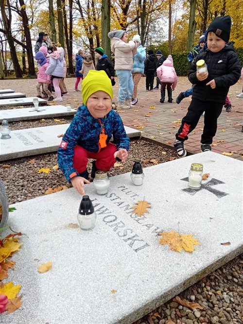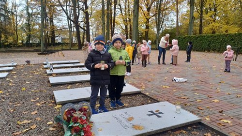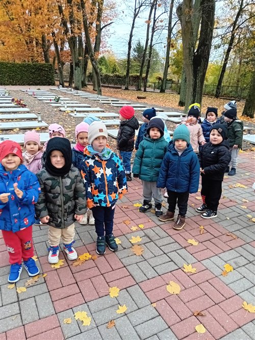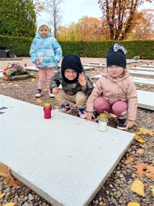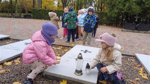 W środę, 29 października, dzieci z naszego przedszkola wybrały się na pobliski cmentarz, aby uczcić pamięć zmarłych z okazji zbliżającego się Dnia Wszystkich Świętych. Przedszkolaki, pod opieką swoich wychowawczyń, odwiedziły Grób Nieznanego Żołnierza. Każde dziecko niosło ze sobą zapalony znicz, który z szacunkiem postawiło na mogile. W ciszy i skupieniu wysłuchały krótkiej opowieści o tym, kim był Nieznany Żołnierz i dlaczego jest tak ważnym symbolem pamięci narodowej. To wyjątkowe spotkanie było dla najmłodszych cenną lekcją patriotyzmu, empatii i szacunku dla zmarłych. W drodze powrotnej przedszkolaki rozmawiały o tym, jak ważne jest pamiętanie o tych, którzy odeszli, oraz o tradycjach związanych z Dniem Zmarłych w polskiej kulturze.