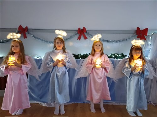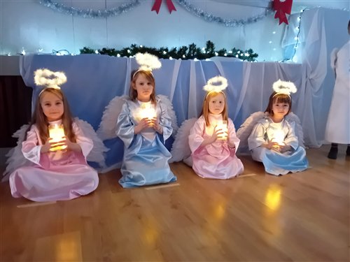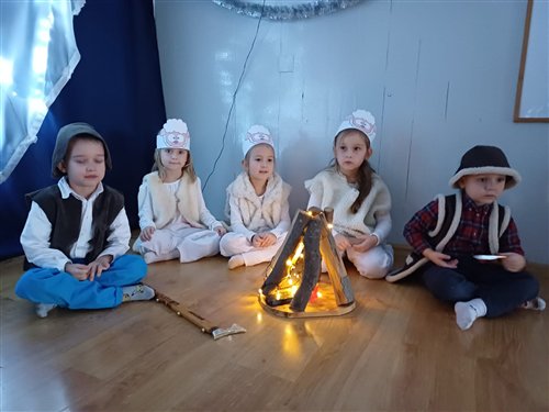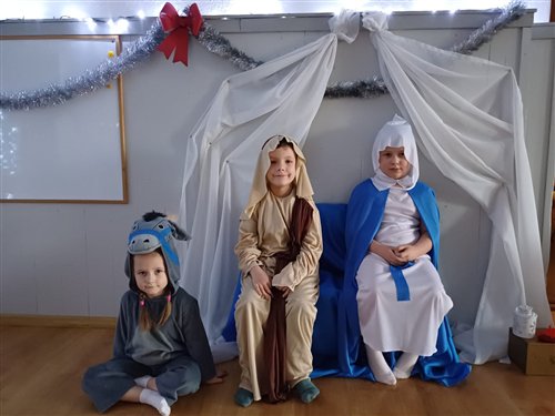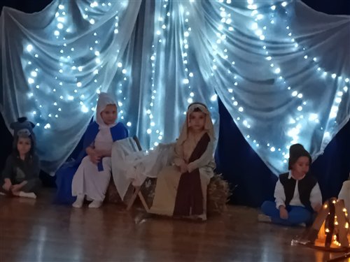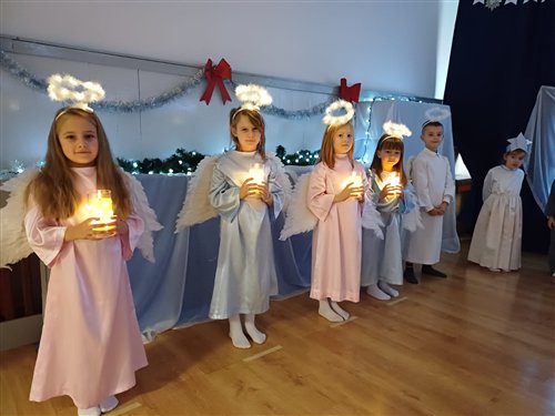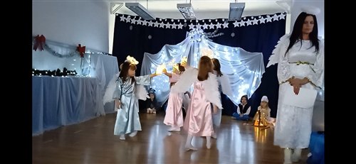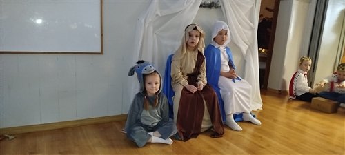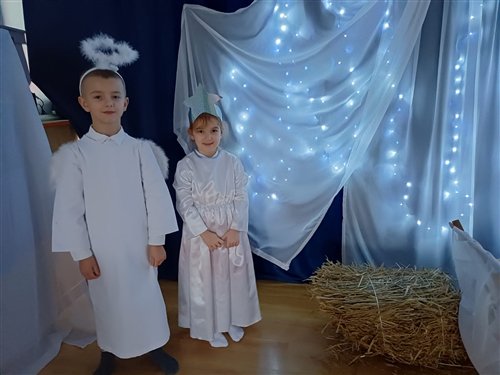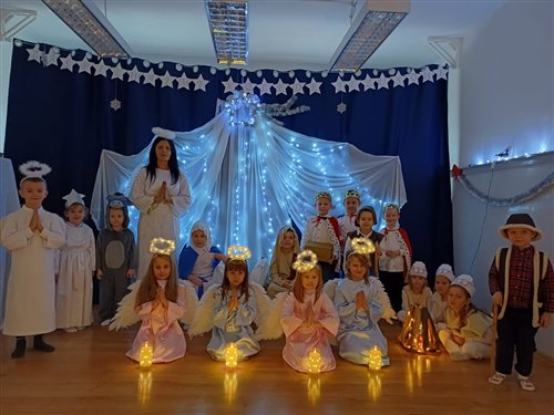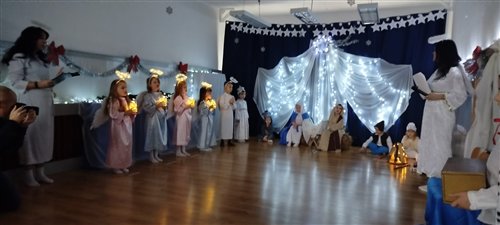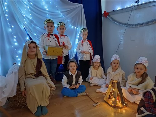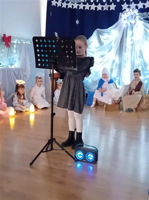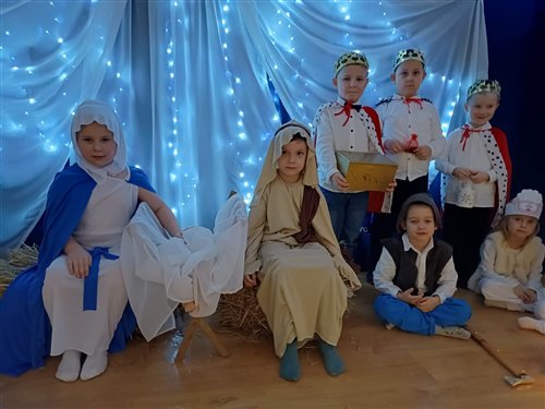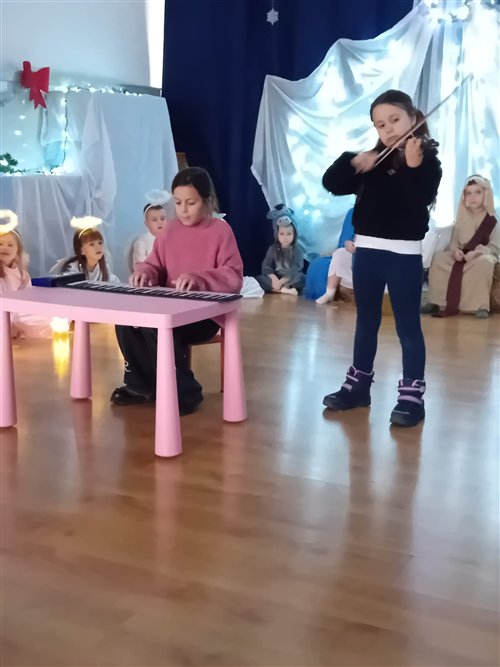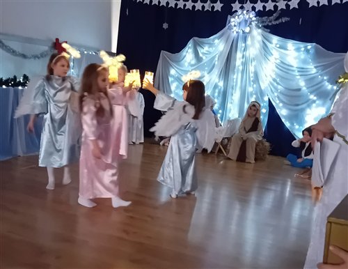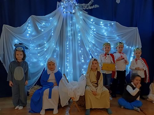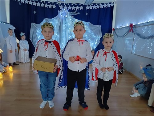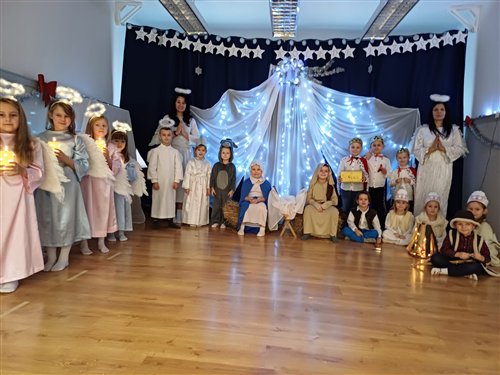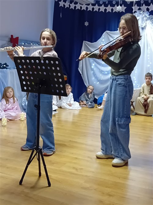 Przed obiadem wigilijnym w naszym przedszkolu odbyły się wyjątkowe jasełka, które wprowadziły wszystkich w świąteczny nastrój. Dzieci z wielkim zaangażowaniem zaprezentowały przygotowane przedstawienie, wcielając się w role Maryi, Józefa, aniołów, pasterzy oraz Trzech Króli. Mali artyści z dumą recytowali swoje kwestie, śpiewali kolędy i pastorałki, a ich barwne stroje oraz piękna scenografia dodały wydarzeniu uroczystego charakteru. Występ był pełen wzruszeń, uśmiechów i radości, a zgromadzeni nauczyciele oraz zaproszeni goście nagrodzili dzieci gromkimi brawami. Tuż po jasełkach swoje zdolności muzyczne zaprezentowali uczniowie Szkoły Muzycznej, którzy zagrali najpiękniejsze kolędy, tworząc wyjątkową, świąteczną atmosferę.