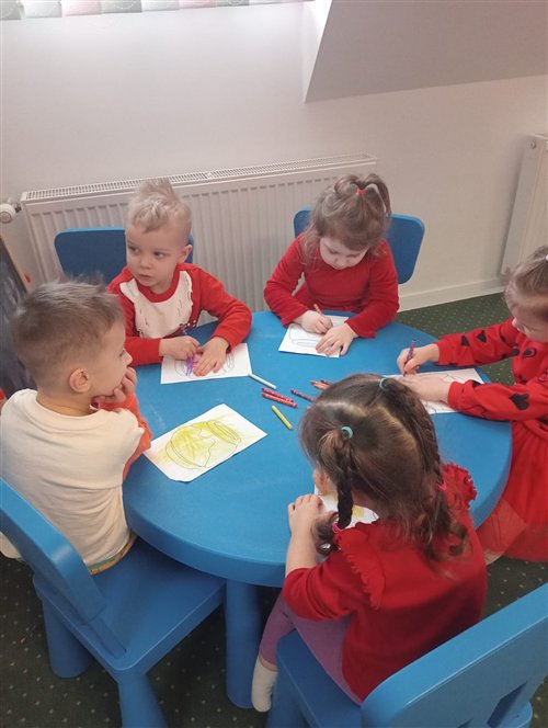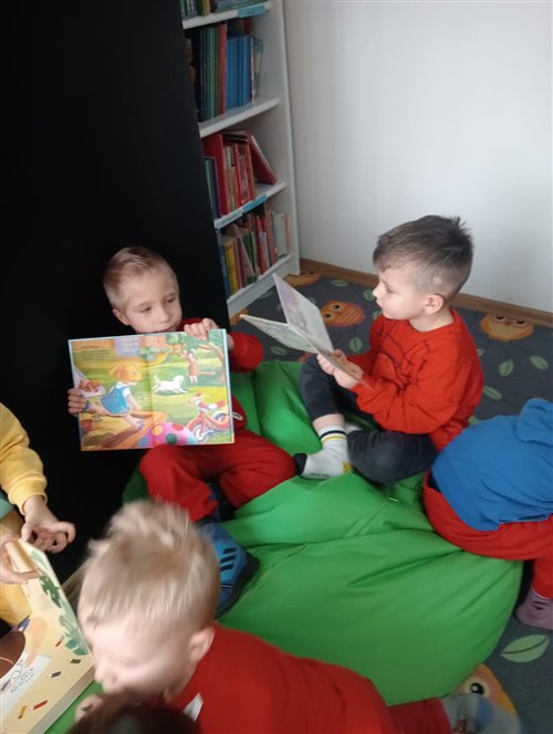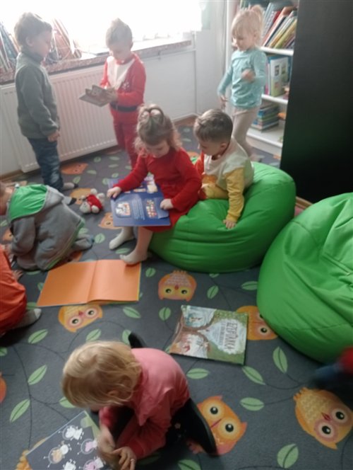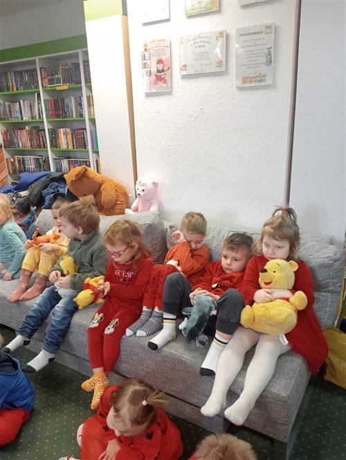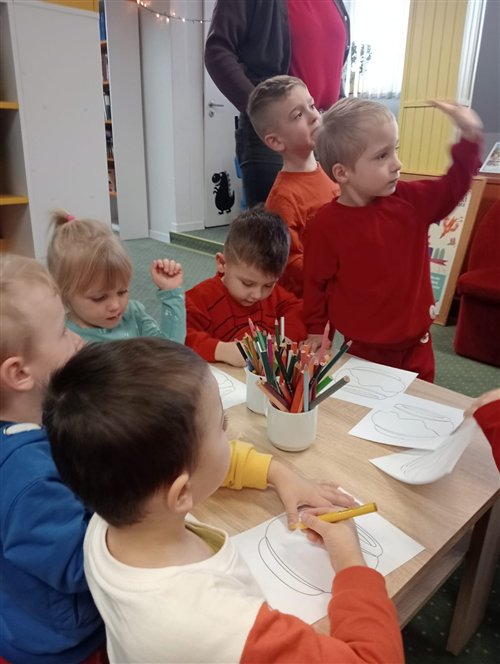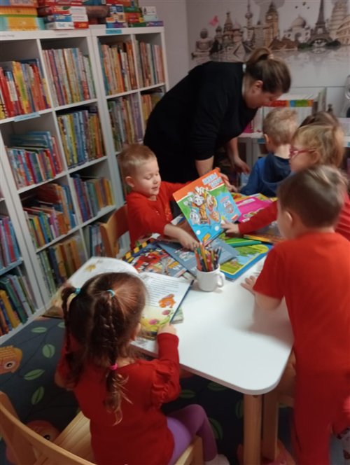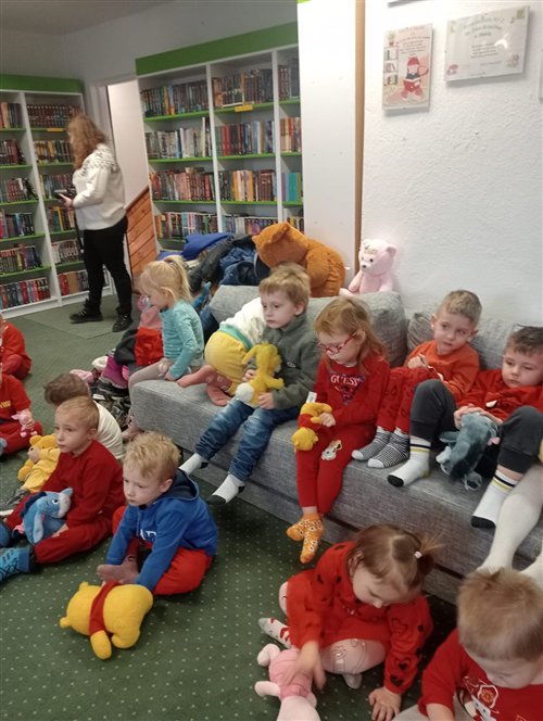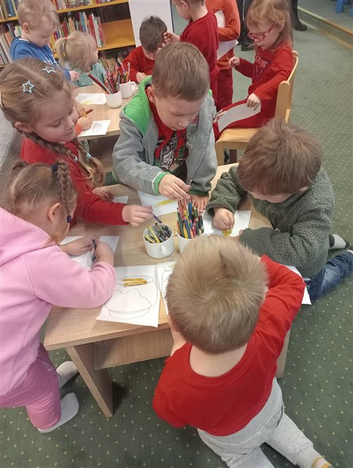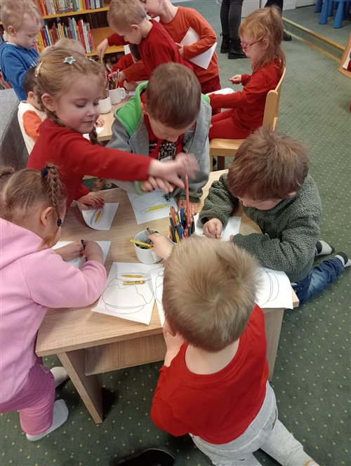 W czwartek, 22 stycznia, grupa „Jeżyki” wybrała się na wyjątkową wycieczkę do Miejskiej Biblioteki Publicznej, gdzie wspólnie obchodziliśmy Urodziny Kubusia Puchatka. Dzieci z ogromnym zainteresowaniem wysłuchały opowiadania o przygodach sympatycznego misia i jego przyjaciół ze Stumilowego Lasu. Spotkanie było pełne radości, uśmiechu oraz literackich inspiracji. Po wysłuchaniu opowiadania przedszkolaki wzięły udział w zajęciach plastycznych, podczas których wykonały prace pod tytułem „Nasze ulubione jedzenie”. Dzieci z dużym zaangażowaniem rysowały swoje ulubione smakołyki, rozwijając wyobraźnię i zdolności manualne. Podczas wizyty poznaliśmy także zasady ogólnopolskiej akcji „Mała książka – wielki człowiek”, która zachęca najmłodszych do czytania oraz częstych wizyt w bibliotece. Pracownicy biblioteki zapoznali dzieci z zasadami zachowania w bibliotece, ucząc je szacunku do książek i wspólnej przestrzeni. Wyjście było cenną i bardzo ciekawą lekcją.