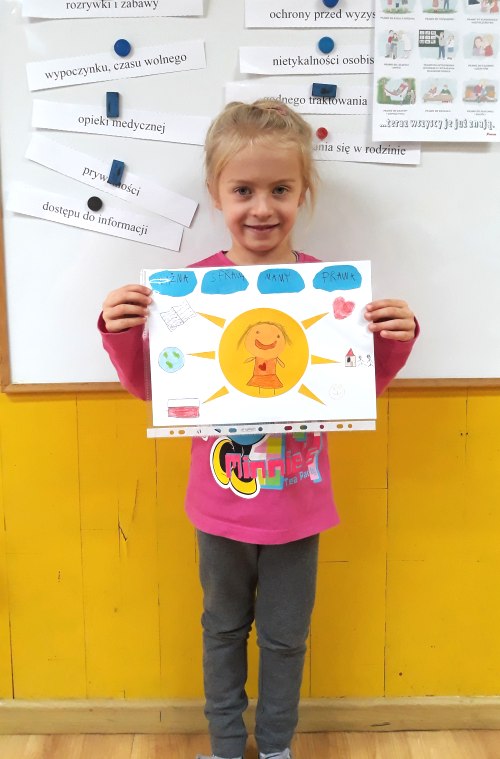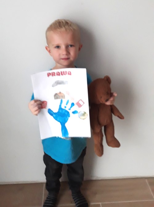 Jasiu z grupy "Jeżyki" i Liliana z grupy "Muchomorki" przygotowali pracę plastyczną na podstawie wiersza pani Doroty Kluski "Prawa dziecka". Pracę zostały zgłoszone do konkursu „Ten dywan ma moc” w ramach realizacji modułu Mały Miś i prawa dziecka.