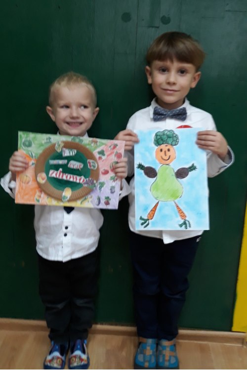 Ogólnopolski konkurs plastyczny dla przedszkolaków „Jem kolorowo, żyję zdrowo”. Prace wykonali Piotruś z „Muchomorków” i Jasiu z „Jeżyków”. Teraz zostało trzymać kciuki za naszych przedszkolaków.